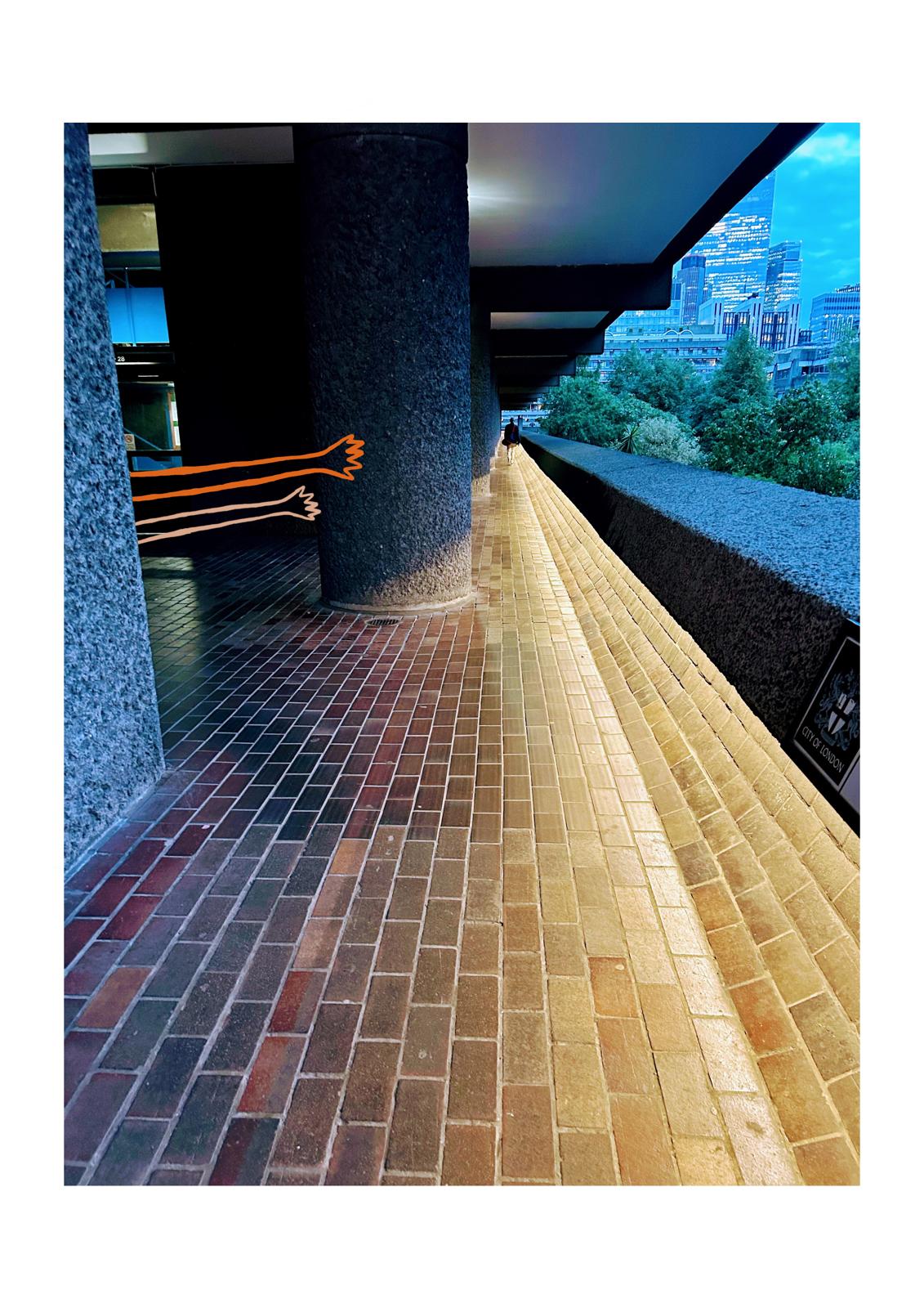 A striking architectural corridor becomes the stage for playful illustrated arms stretching out from behind a concrete column. The mix of urban geometry and unexpected hand-drawn elements creates a humorous, slightly surreal moment frozen in time. Perfect for fans of quirky art, bold city photography and imaginative visual twists.