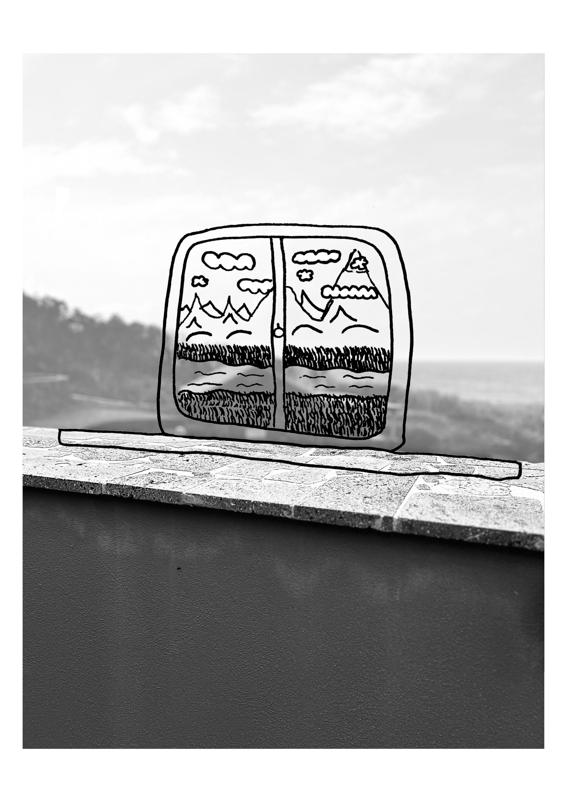 A black-and-white photograph transformed with a hand-drawn minimalist illustration, creating the illusion of a window opening into an imaginary world. Mountains, clouds, and rivers blend fantasy with reality, resulting in a poetic and contemporary piece perfect for lovers of conceptual and visual storytelling art.