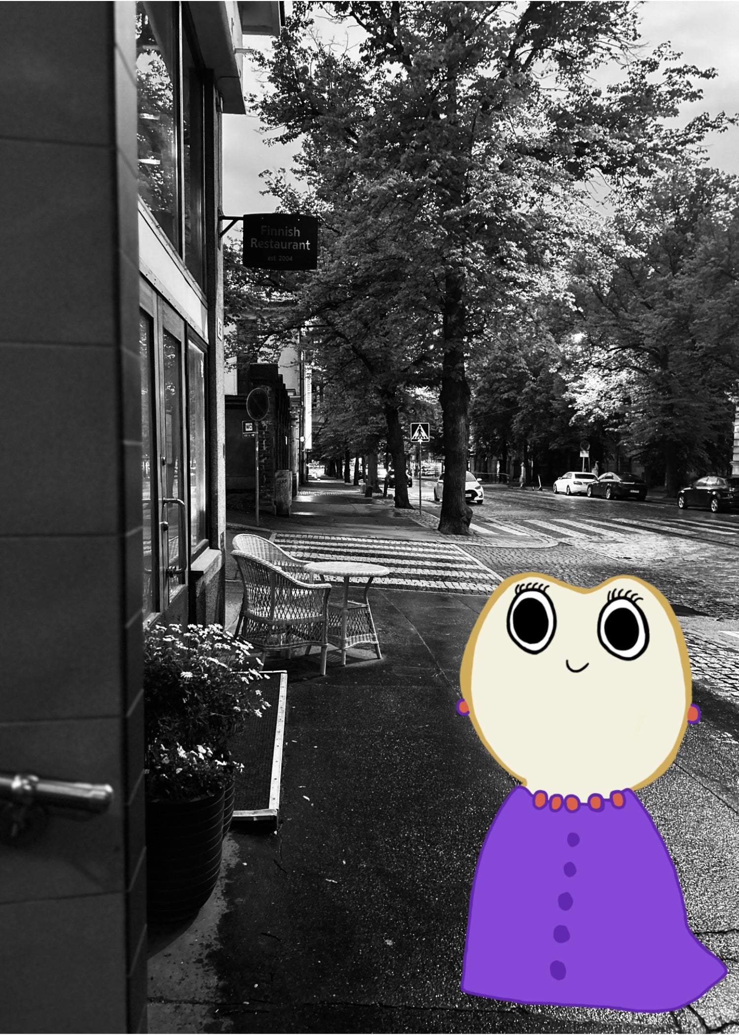 A black-and-white city street photograph brought to life with a charming hand-drawn character in bold colours. This playful contrast between realism and illustration creates a whimsical scene that feels both familiar and imaginative. A unique piece for anyone who loves storytelling artwork and vibrant character design.